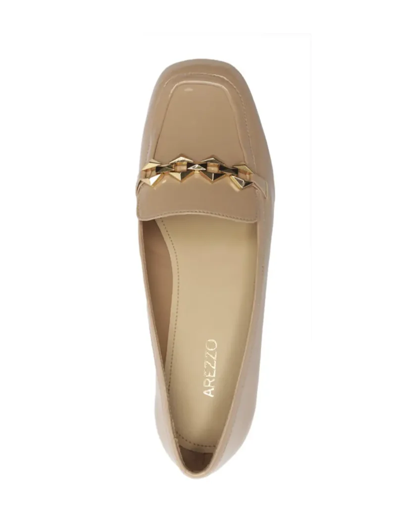 Loafer em pele beige e acabamento em verniz. Este loafer da Arezzo traz consigo a mistura da elegância com as linhas clássicas que enaltecem este modelo.