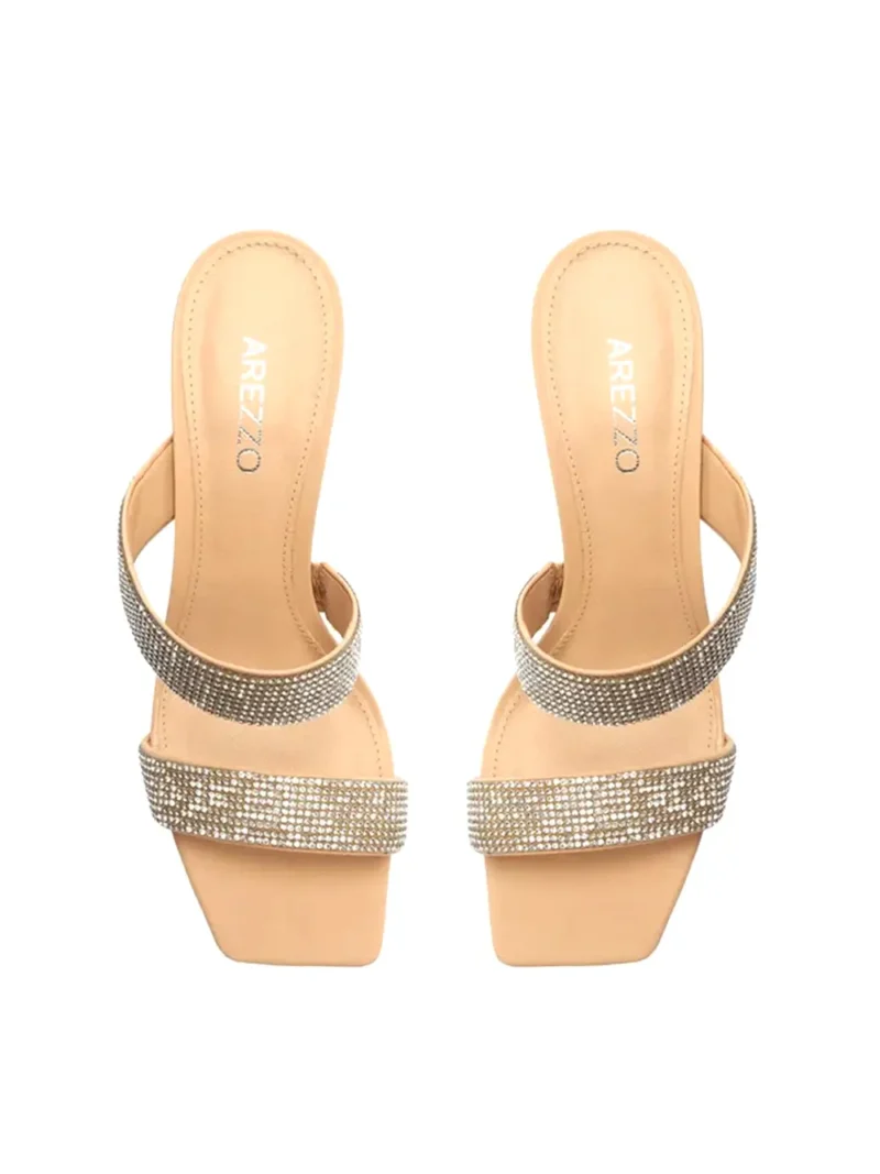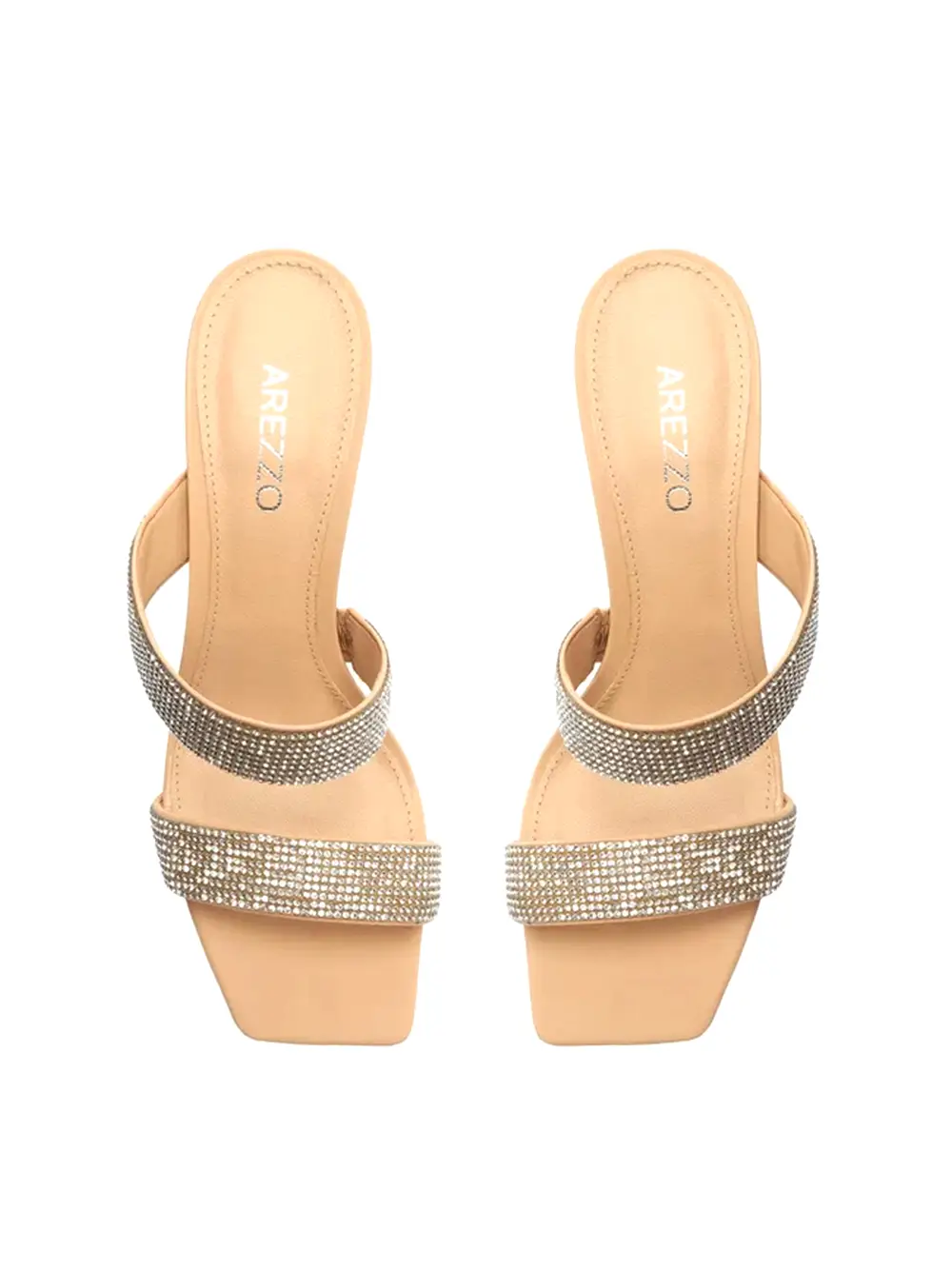 Sandália em pele beige com duas tiras e aplicação de cristais. Esta sandália da Arezzo traz consigo a mistura da elegância com as linhas clássicas que enaltecem este modelo.
