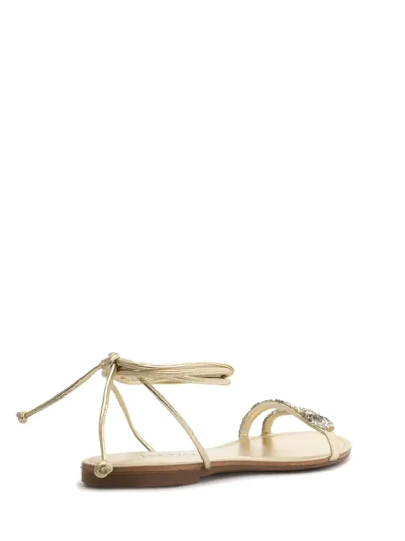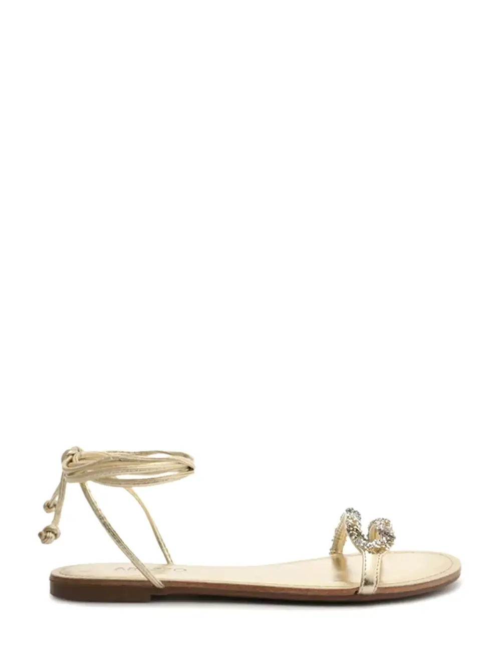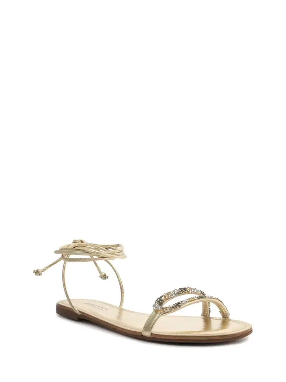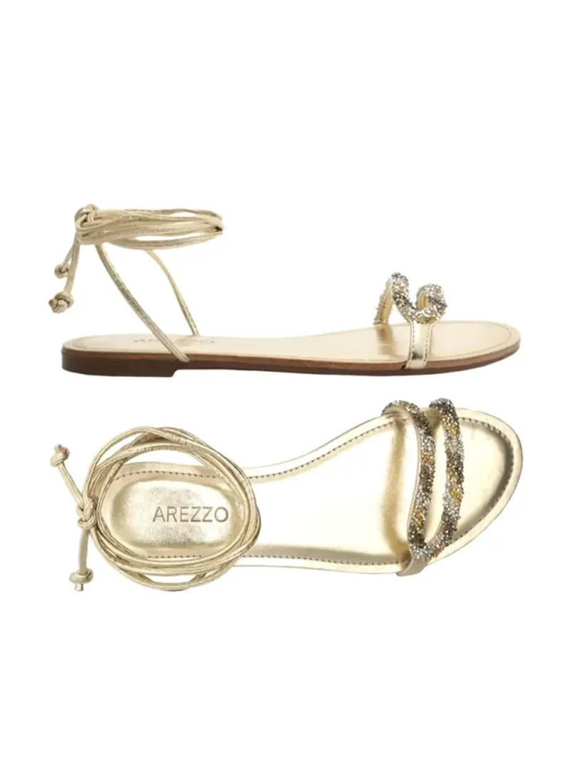 Sandália rasa em pele dourada com múltiplas tiras e amarração no tornozelo. Esta sandália da Arezzo traz consigo a mistura da elegância com as linhas clássicas que enaltecem este modelo.